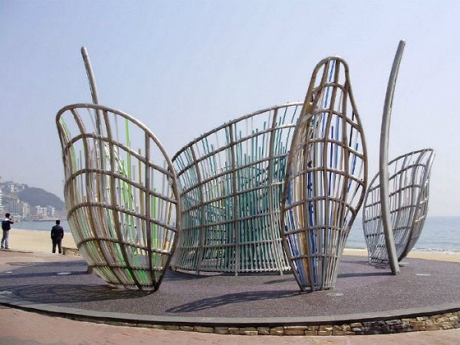 해운대 해변에 세워진 미국 설치작가 데니스 오펜하임의 유작 ‘꽃의 내부(2009)’. 해운대구청은 올해 1월 부식과 민원제기를 이유로 일방적 폐기 처리했고, 미술계에서는 ‘시설물과 조형물을 구분하지 못하는 관료행정’이라는 비난이 일었다