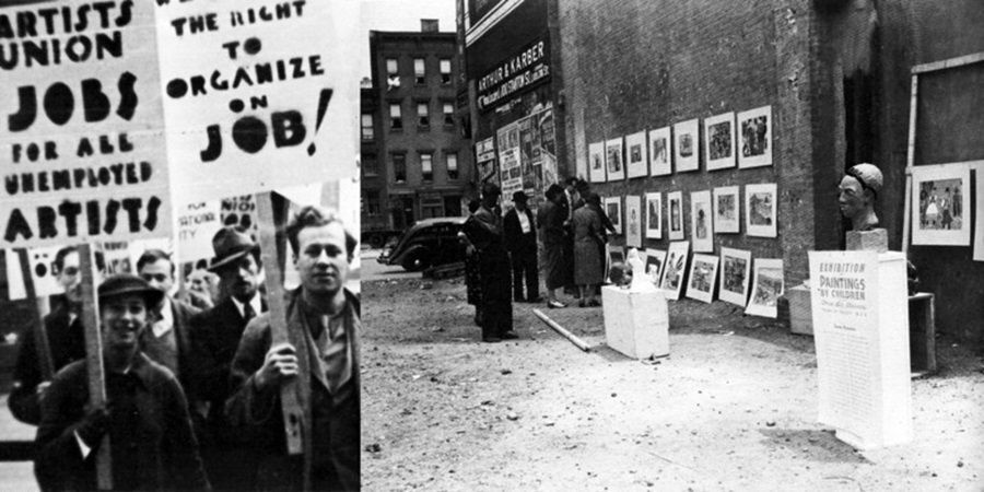 - 왼쪽: 경제 대공황 시절 구직 시위를 벌이는 예술가들