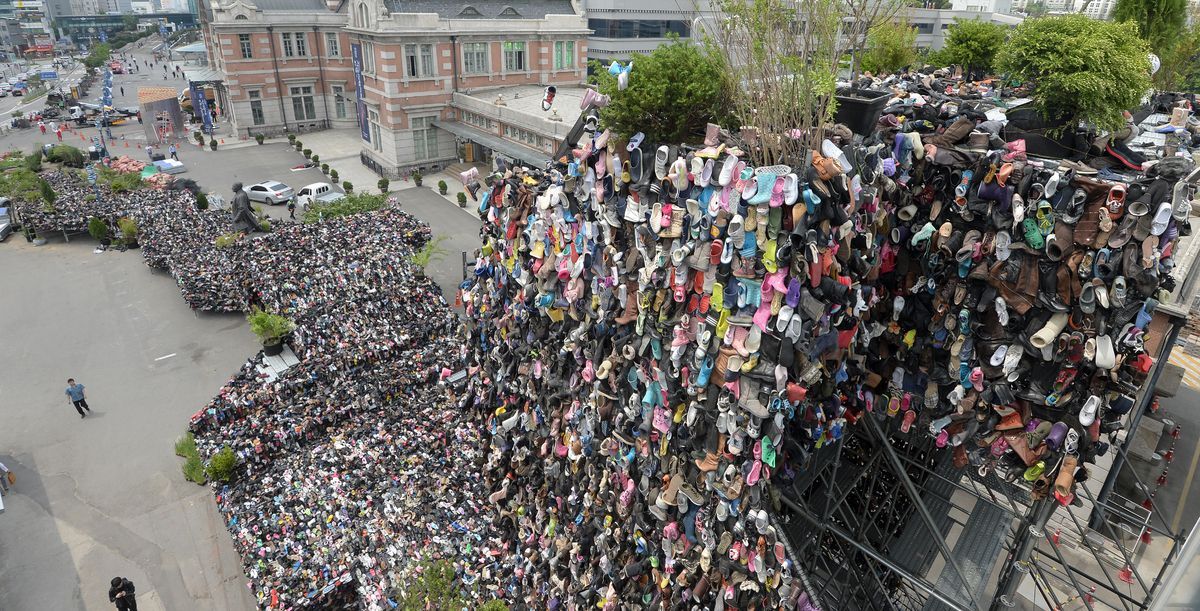 버려진 신발 3만 켤레를 주재료로 만든 이 작품에 대한 시민들의 반응은 극명히 엇갈렸습니다. 냄새를 비롯해 미관상 불쾌감을 일으킨다는 의견이 미디어에 확대 보도되었고, 연이어 겨우 열흘 동안 전시될 작품에 1억 4천만 원 가량의 예산을 사용했냐는 질책이 일었죠.